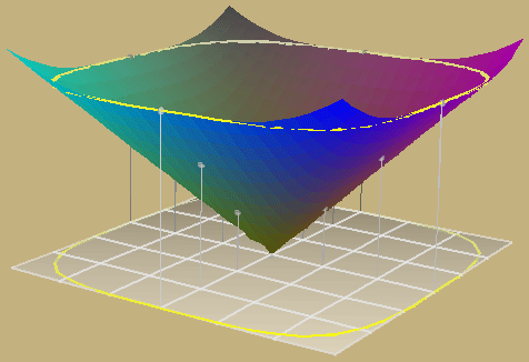 No applet, quando n é par, não está representada a parte da superfície em que z é negativo, que é simétrica relativamente ao plano (voltar).