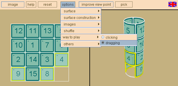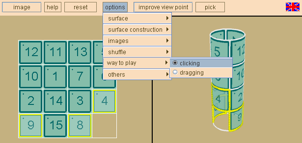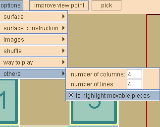 There is an empty position in the puzzle at all times. The pieces next to that position appear with a yellow border and it is possible to move them into the empty position by clicking or dragging. The pieces with the yellow border are the only ones which can be moved at any moment; we will call them "movable pieces".