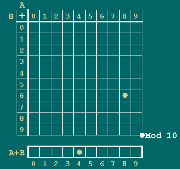 2. Suponhamos que queremos saber qual a soma de 6 com 8 em módulo 10. Em primeiro lugar, colocamos o ponto verde, em cima, no quadrado correspondente à linha 6 e à coluna 8. O ponto verde, em baixo, indica o resultado desta soma. Na figura acima, vemos que o resultado pretendido é quatro.